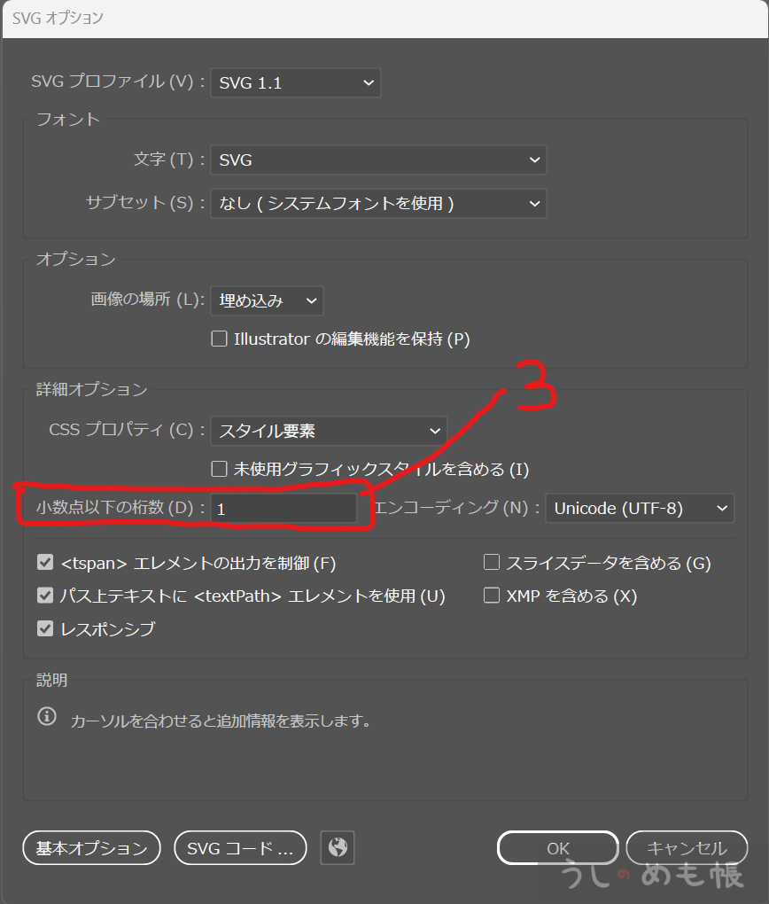 AdobeIllustratorで作成したファイルをSVG形式で保存をすると、ダイアログが表示されますが、