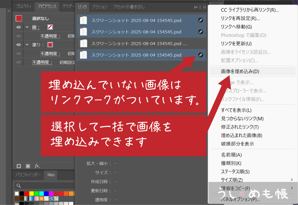 画像を使っている場合配置そのままだと元データを介して表示している状態(リンクファイル)です。