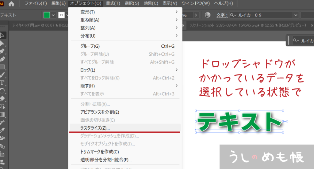 ドロップシャドウなど、透過がかかるような効果はそのまま印刷するとトラブルを起こすことが多く、ラスタライズをする必要があります。