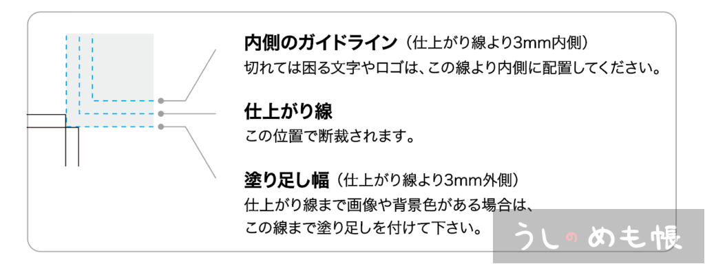 印刷会社で用意されているテンプレートを見るとわかりやすいのですが、印刷エリアに大体3つのガイドが設置されています。