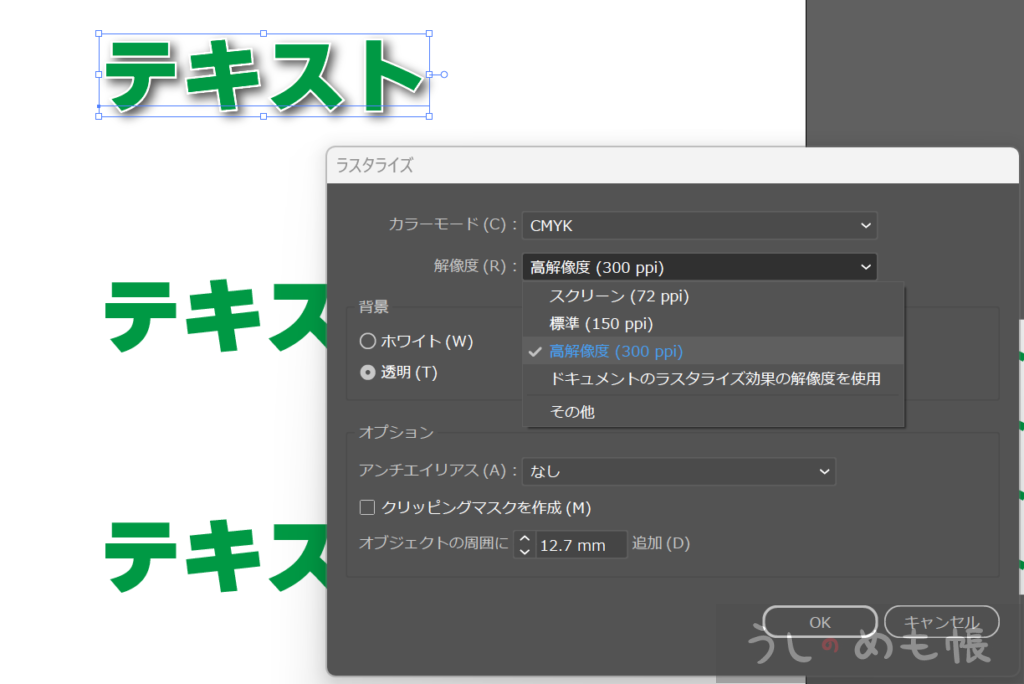 ドロップシャドウは、解像度が低いと粗く印刷されますので、ラスタライズ時の解像度は300ppi以上で設定するといいでしょう。