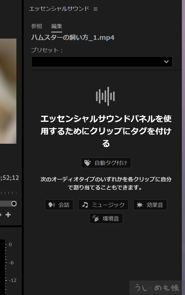 ワークスペース上にない場合はメニューから ウィンドウ → エッセンシャルサウンド にチェックを入れる