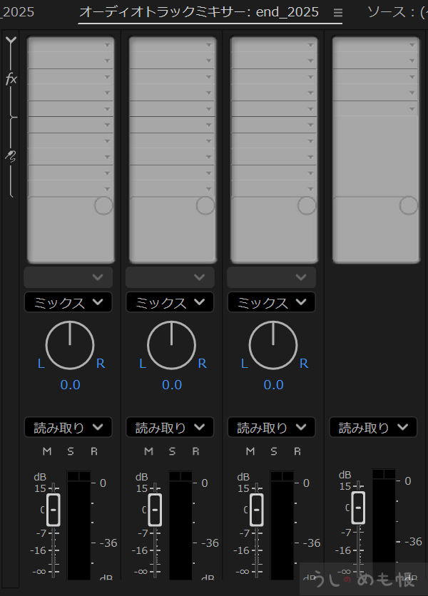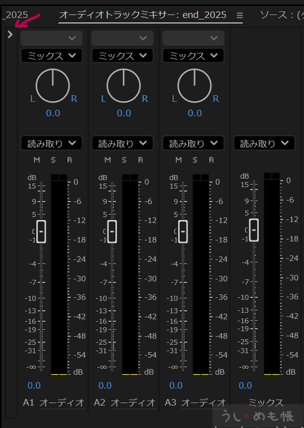 オーディオトラックミキサーがない場合は ウィンドウ → オーディオトラックミキサー に✔を入れます。
