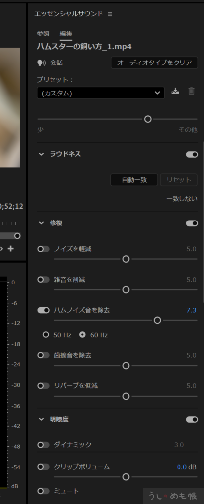 ラウドネスを自動一致 をオンにするとPremiereがAI的に分析して、適切なLUFSに調整してくれます。