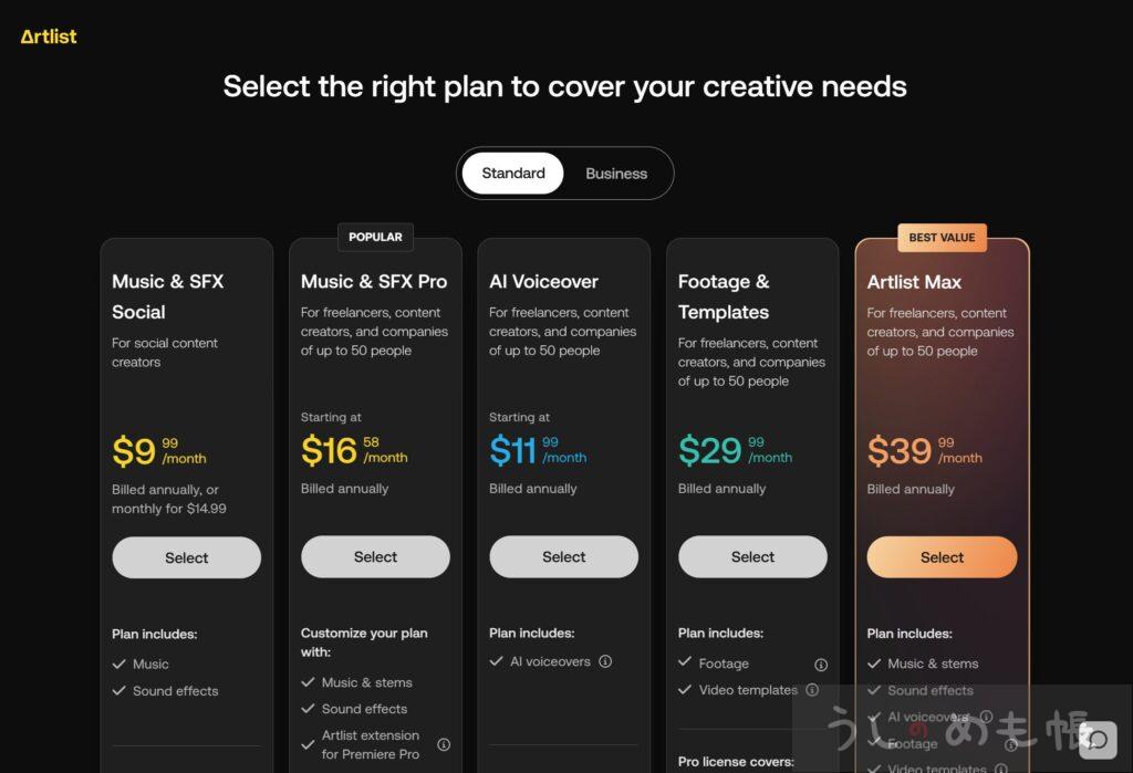 | 比較 Music & SFX Pro(Standerd) | $299.0($24.92/月) | $199.00($16.58/月) | $479.88($39.99/月) |