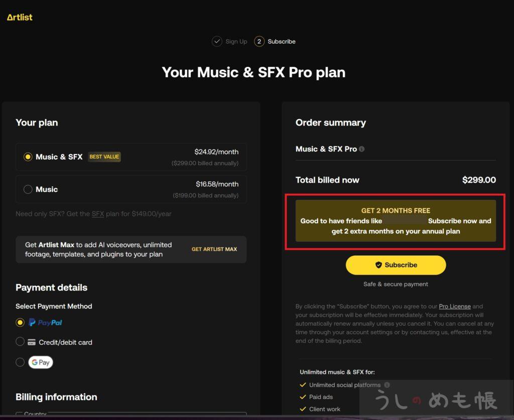 右下の Subscribe & Get 2 Extra Months ボタンから進んでください。