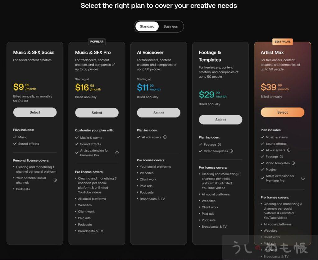 表向きはこの5個ですが、PROプランのMusic & SFX Proを選択すると Music($199/年)だけ とSFX($149/年)だけ の選択ができます。