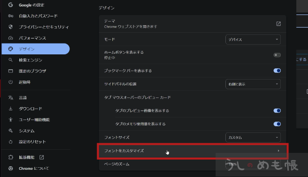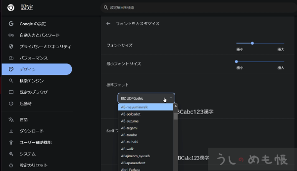 ブラウザ右上の3つの点をクリックし、下から二番目の「設定」をクリック→左のメニューから「デザイン」をクリック→デザイン項目が表示されるので「フォントをカスタマイズ」を選択するとフォントの設定が表示されます。